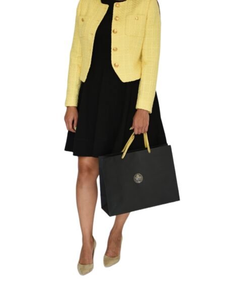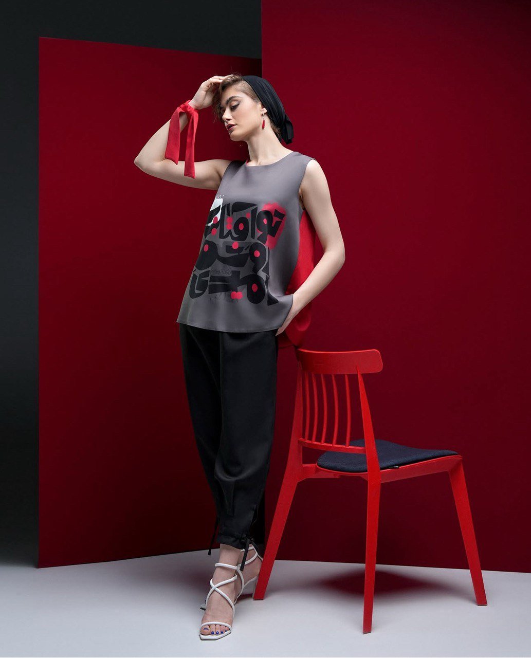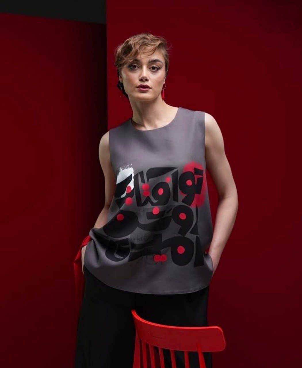 This elegant asymmetrical top, inspired by Rumi’s timeless poem “Jân Fedâ,” beautifully merges art, poetry, and modern design. The vibrant yellow satin panel drapes diagonally over a crisp white base, creating a striking and contemporary silhouette. Across the yellow canvas, expressive Persian calligraphy swirls around a bold black horse motif — symbolizing joy, freedom, and the soul’s journey beyond sorrow.