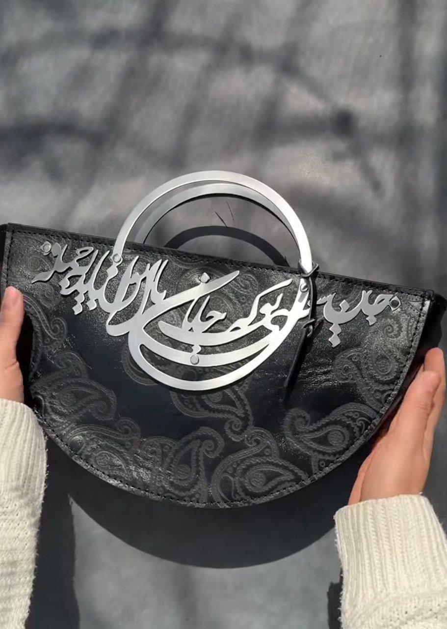 This elegant black leather bag features exquisite Persian calligraphy detailing, blending timeless artistry with modern design. Crafted from high-quality textured leather, it is finished with a secure top zipper closure and sleek metal handles for a refined look and comfortable carry.