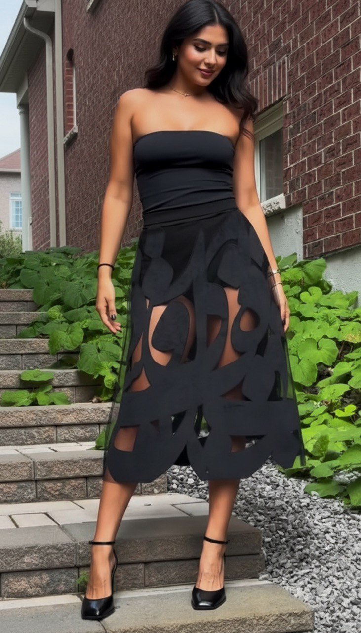 A long black organza skirt layered over a built-in short skirt, finished with elegant velvet calligraphy detailing along the lower portion.
