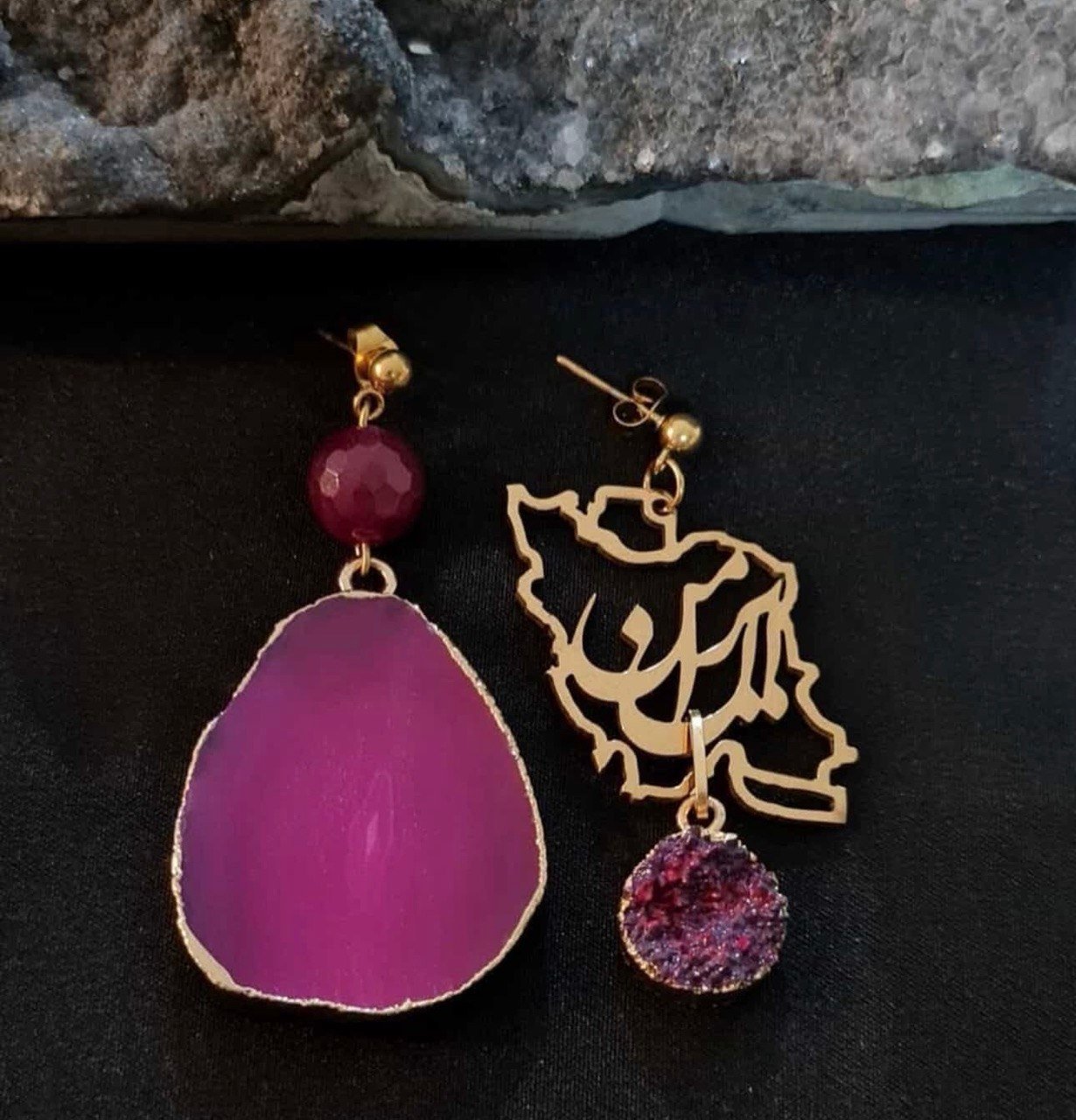 These unique, handcrafted earrings beautifully blend art and elegance. Featuring an asymmetrical design, one earring showcases a bold purple stone with a soft matte finish, accented by a faceted bead for added depth. The other earring highlights a delicate gold-tone Iran map silhouette with Persian calligraphy, finished with a shimmering druzy-style purple gemstone.