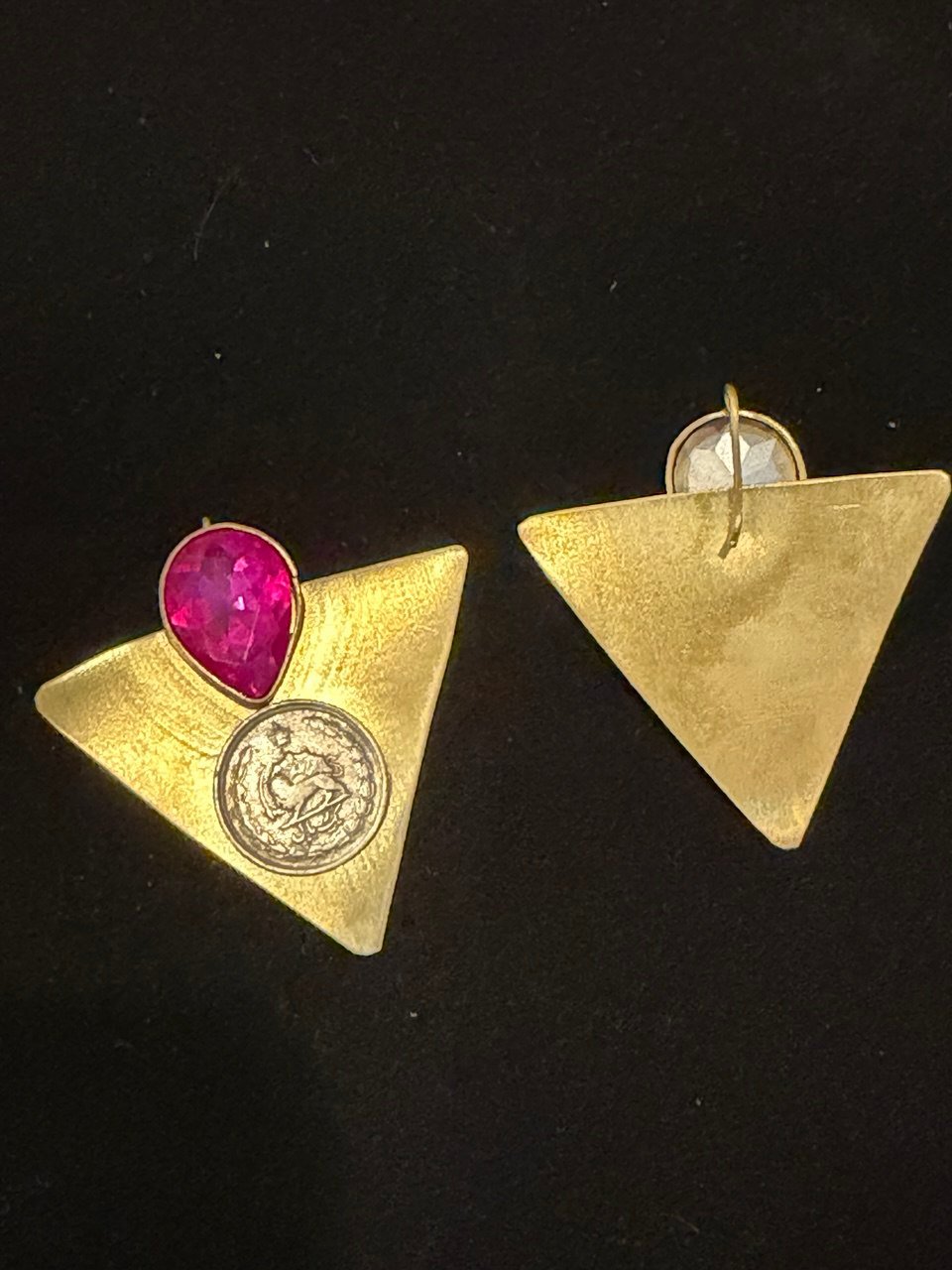 These striking handmade earrings feature a bold triangular gold-tone base paired with a vintage-style Persian coin at the center. Topped with a faceted ruby-tone teardrop stone, the design blends geometric modernity with rich cultural heritage.
