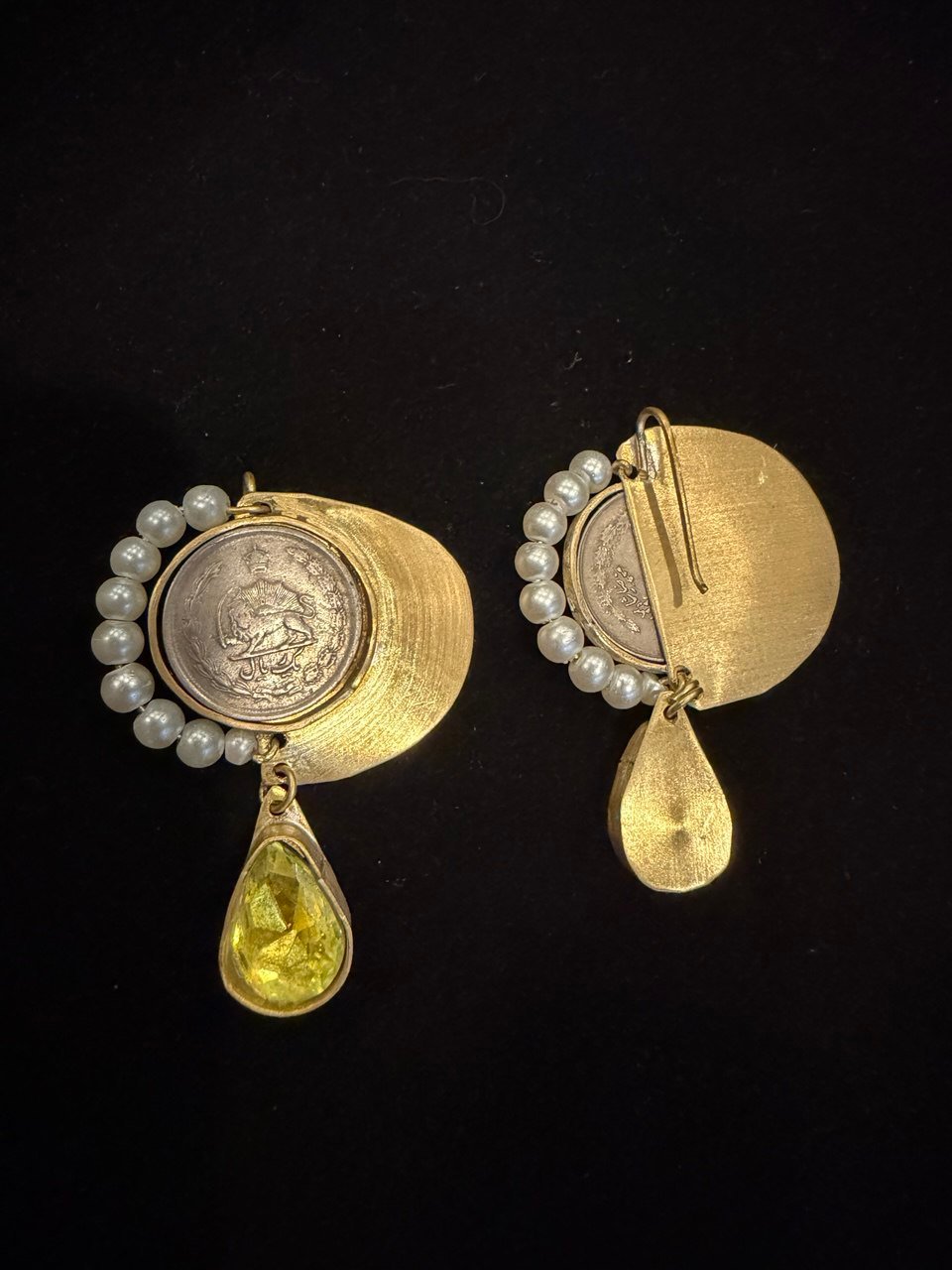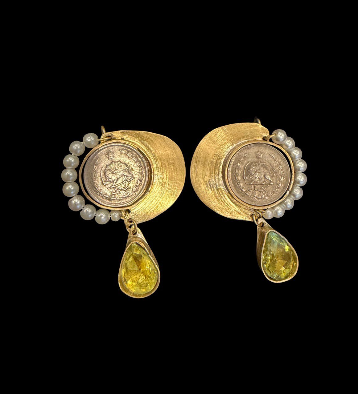 These elegant handcrafted earrings feature an intricate gold-tone filigree design inspired by traditional Persian motifs. Each earring is accented with a vintage-style Persian coin, creating a beautiful contrast between detailed metalwork and historical symbolism.