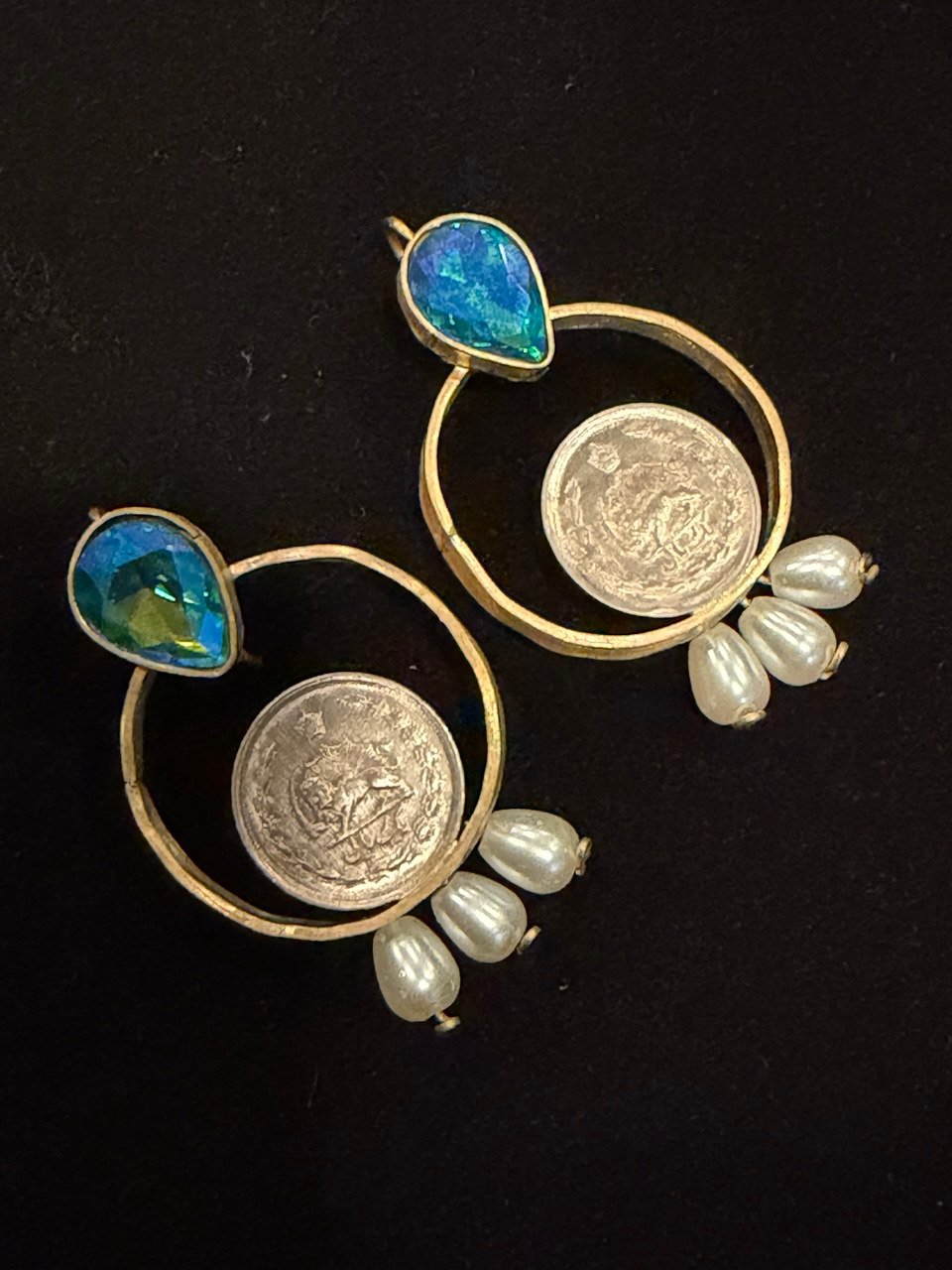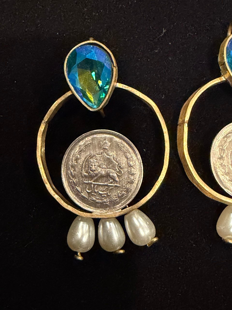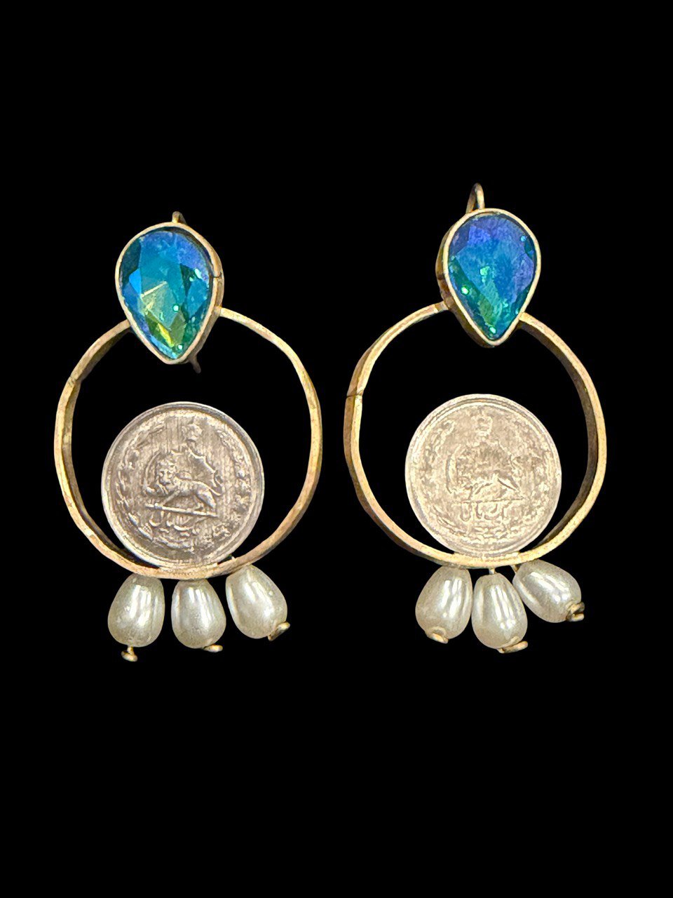 These stunning handcrafted earrings blend timeless elegance with rich cultural heritage. Featuring a vibrant ruby-toned teardrop stone set in a gold-tone frame, each earring is accented with a circular hoop showcasing a vintage Persian coin detail. Delicate pearl drops add movement and a soft, luxurious finish.